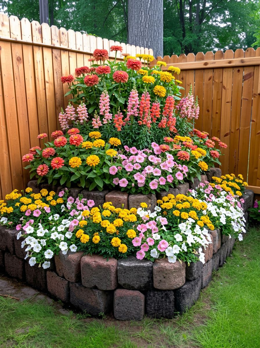 Turn any dull yard corner into a technicolor showstopper with this tiered planter concept. Using stacked concrete blocks, the multi-level raised bed forms a small pyramid, packed to the edges with masses of bright annuals—think magenta, orange, white, and yellow blooms. A sea of fresh green grass surrounds the planter, with a warm wood fence creating a snug backdrop. The stepped design adds both height and plenty of surface area for flowers, all arranged in cheerfully organized layers.