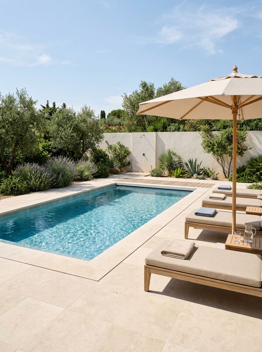 This minimalist pool design is all about relaxation through simplicity. The crisp rectangular pool is the star, surrounded by smooth light concrete pavers and a row of perfectly arranged sun loungers. An umbrella provides a shady respite, while the uncluttered design lets the reflective blue water and warm wood accents shine. With its open and airy layout and a palette of white, beige, and muted blue, this is modern luxury defined—no chaos, just calm.