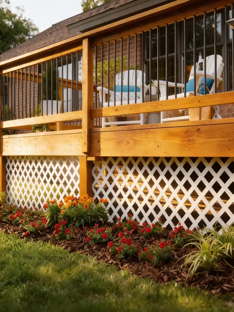 This scene is pure backyard comfort—warm, stained timber railings join up with classic white lattice underneath. Black balusters provide a subtle modern twist, but the overall vibe remains inviting and homey. A flower bed filled with red and orange blooms brings extra cheer, while the afternoon sunlight warms up the wood grain and brings depth to the skirting.