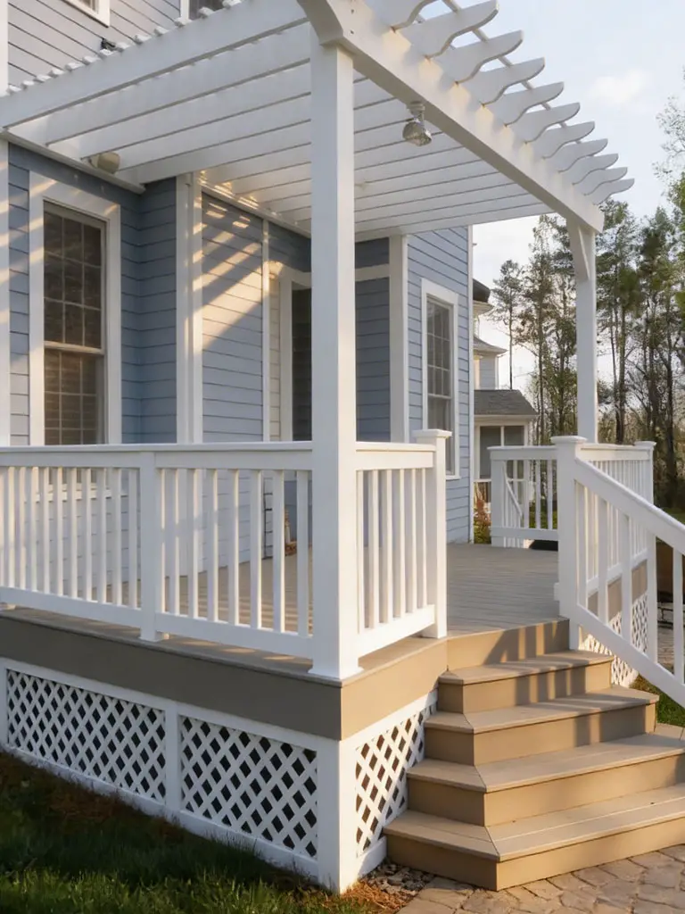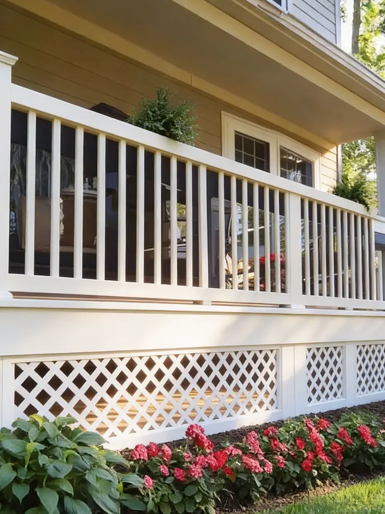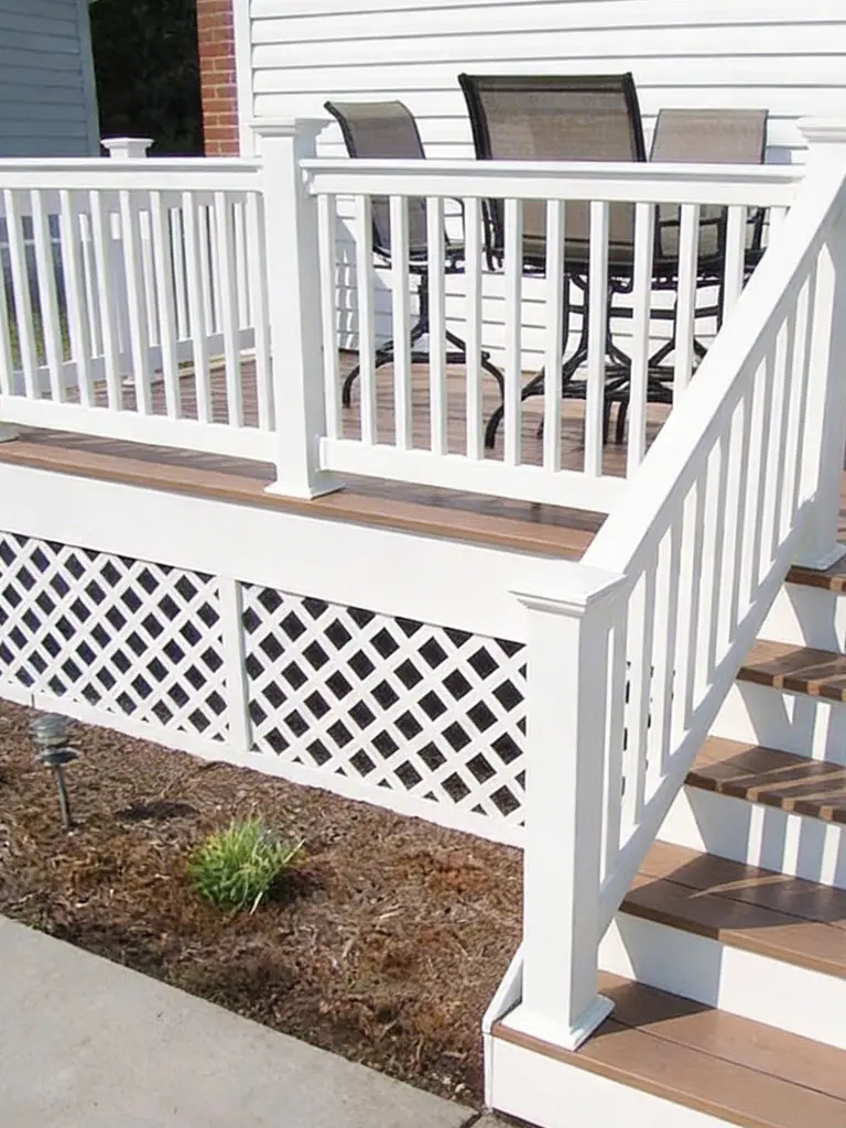 - Bright white deck railings with matching lattice skirting
