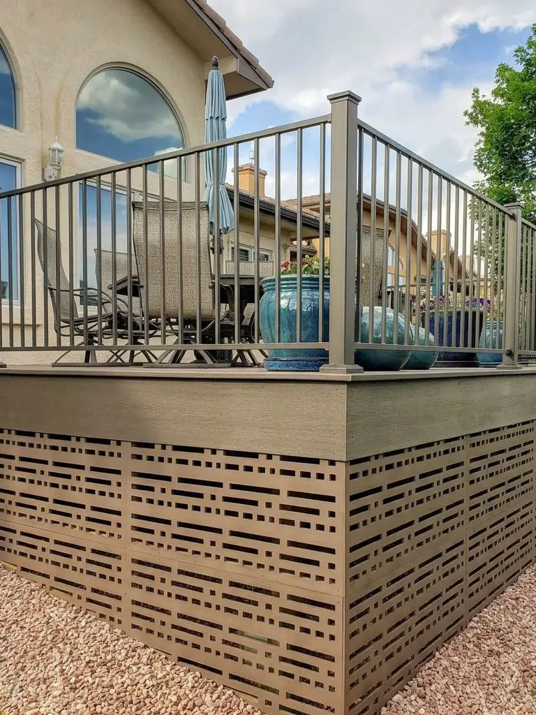 - Taupe-painted lattice panels under the deck
