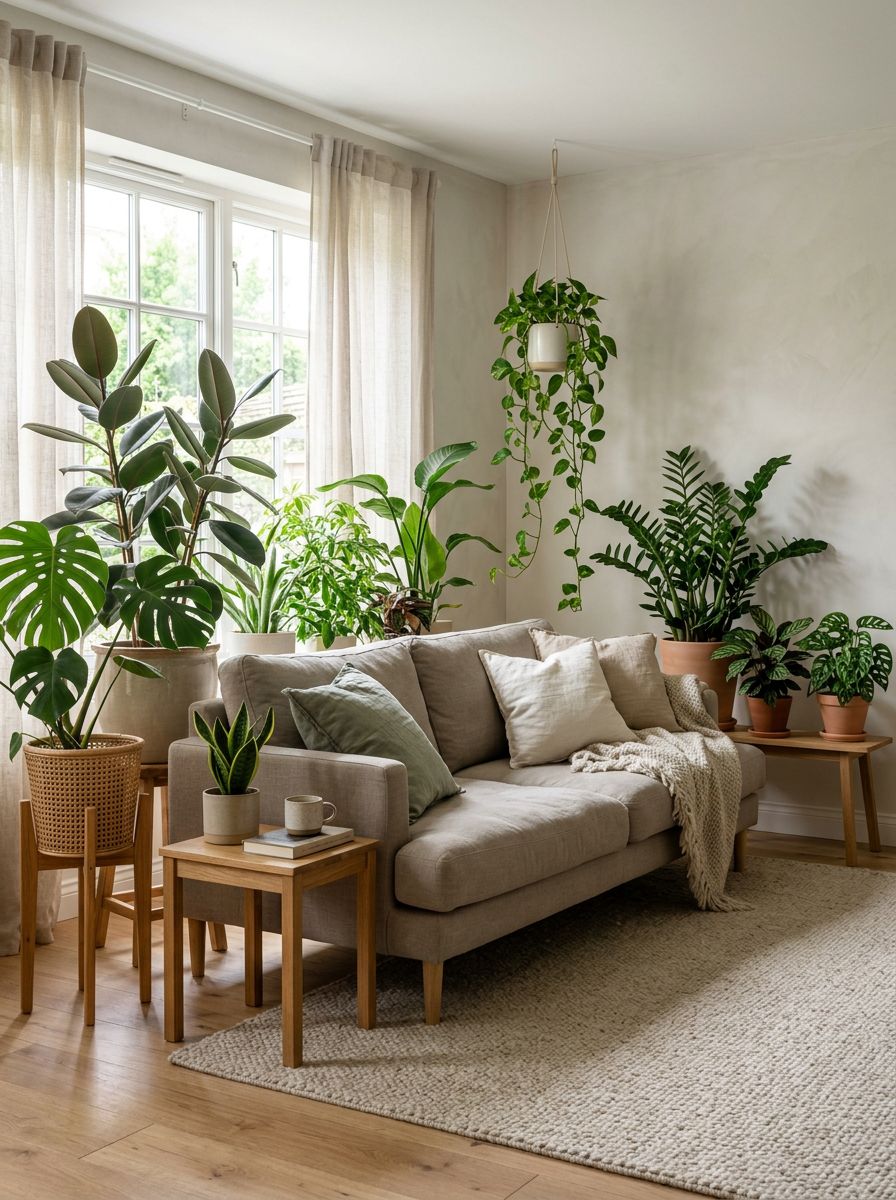 2. Soft Neutral Living Room Styled With Layered Potted Plants
