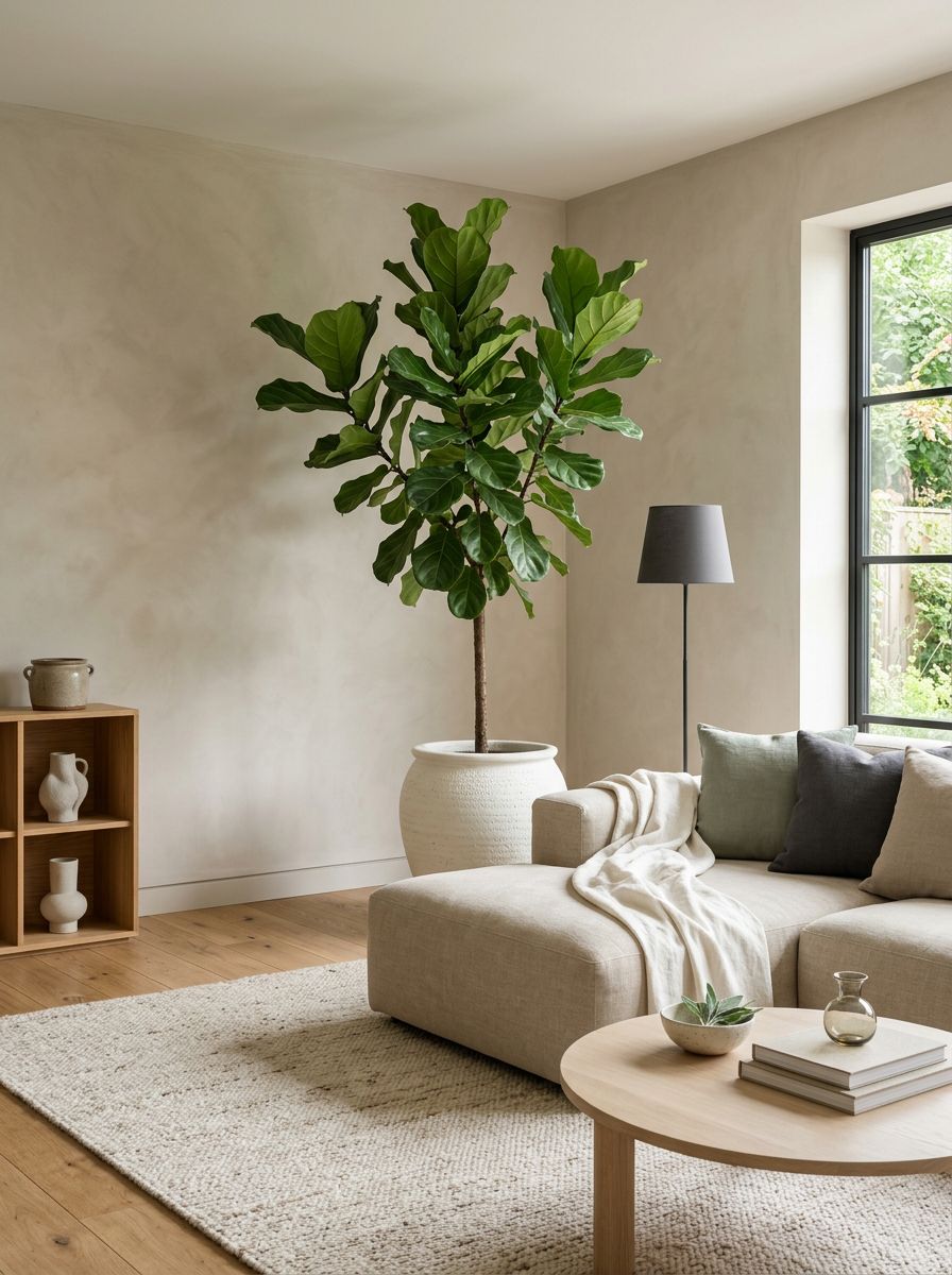 Japandi style blends Japanese minimalism with Scandinavian warmth, and a tall fiddle leaf fig fits right into that aesthetic. Its broad, sculptural leaves add a dramatic yet organic touch to any room.