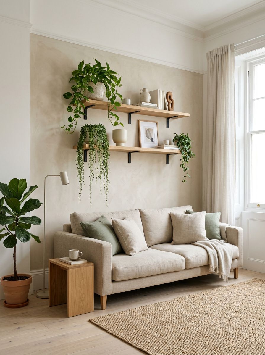 4. Airy Minimalist Living Room With Floating Shelves and Trailing Plants