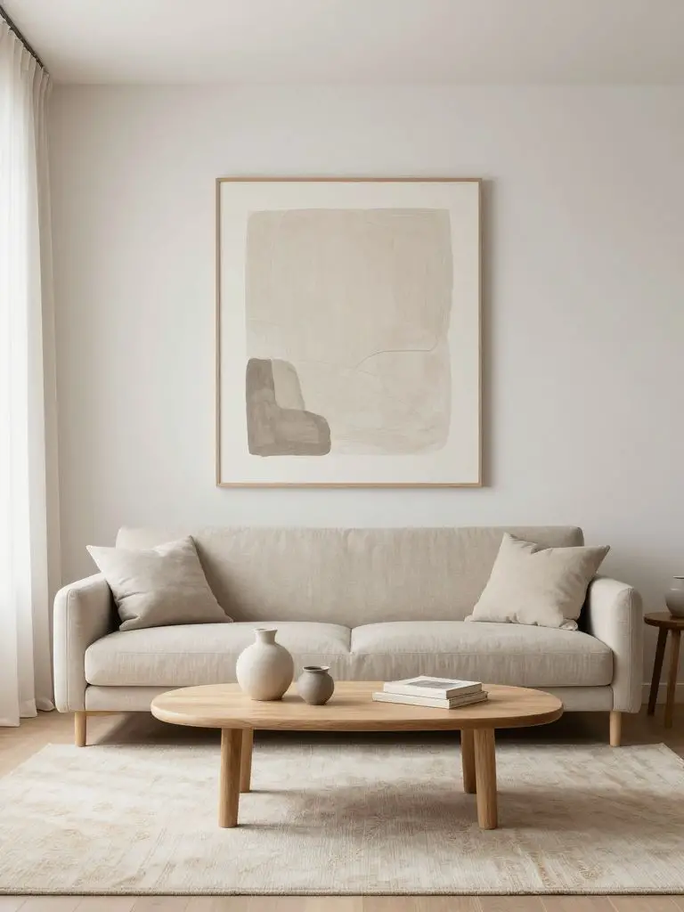Less is more when it comes to wall art in a Scandinavian minimalist living room. Choose one or two statement pieces rather than filling every wall. Black-and-white photography, simple line drawings, or abstract prints work beautifully.