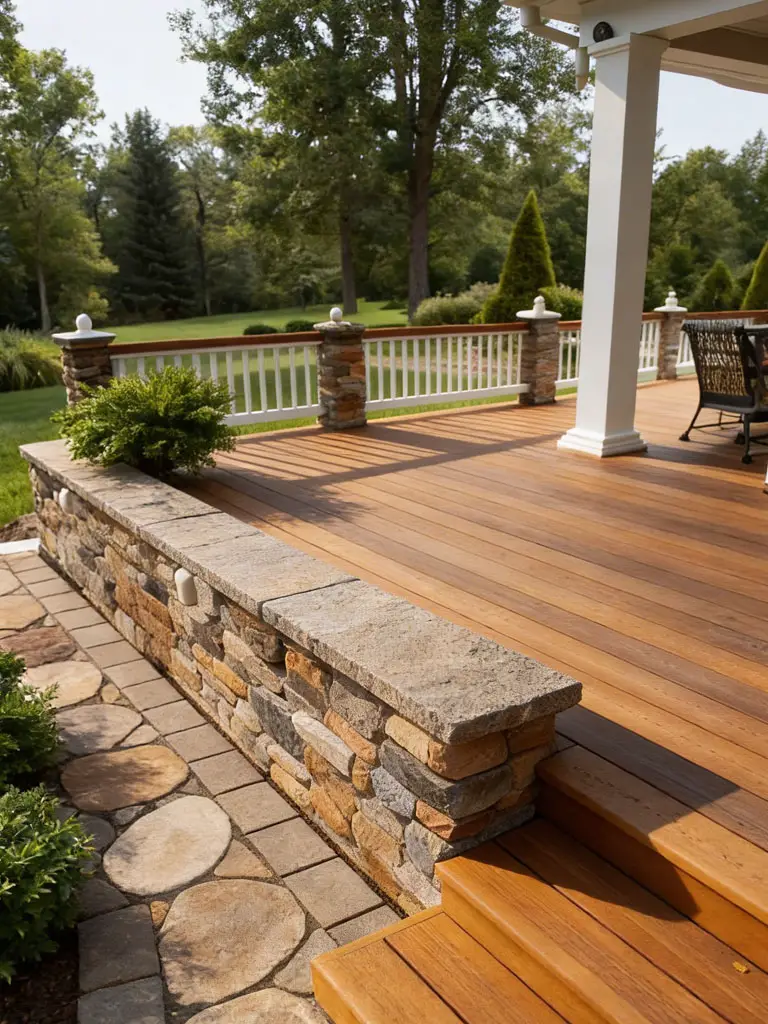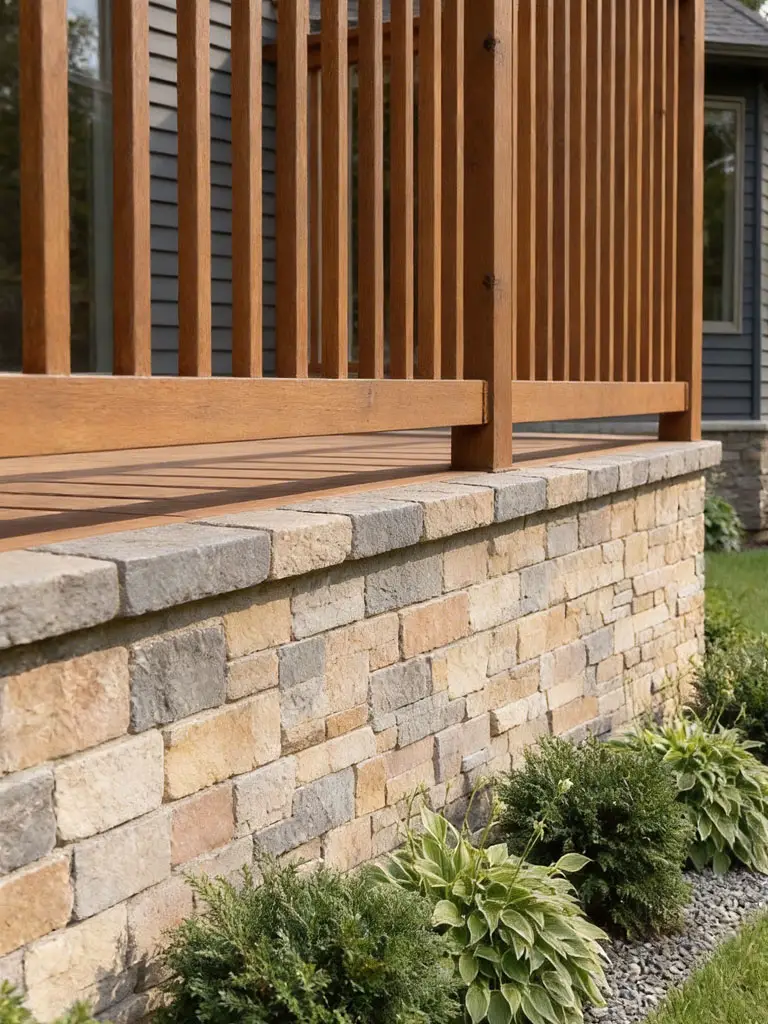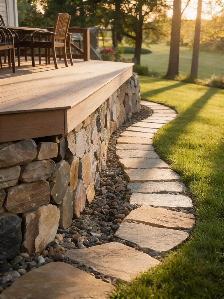 Here’s a great example of deck skirting with stone meeting modern rustic design. This elevated wooden deck is grounded by warmly toned stacked stone skirting and features honey oak steps that descend cleanly into a paved walkway. The strong linear composition highlights functional design with stylish texture contrast. Bright, diffused daylight keeps everything looking fresh and inviting, while soft grays, browns, and green touches from landscaping provide balance.