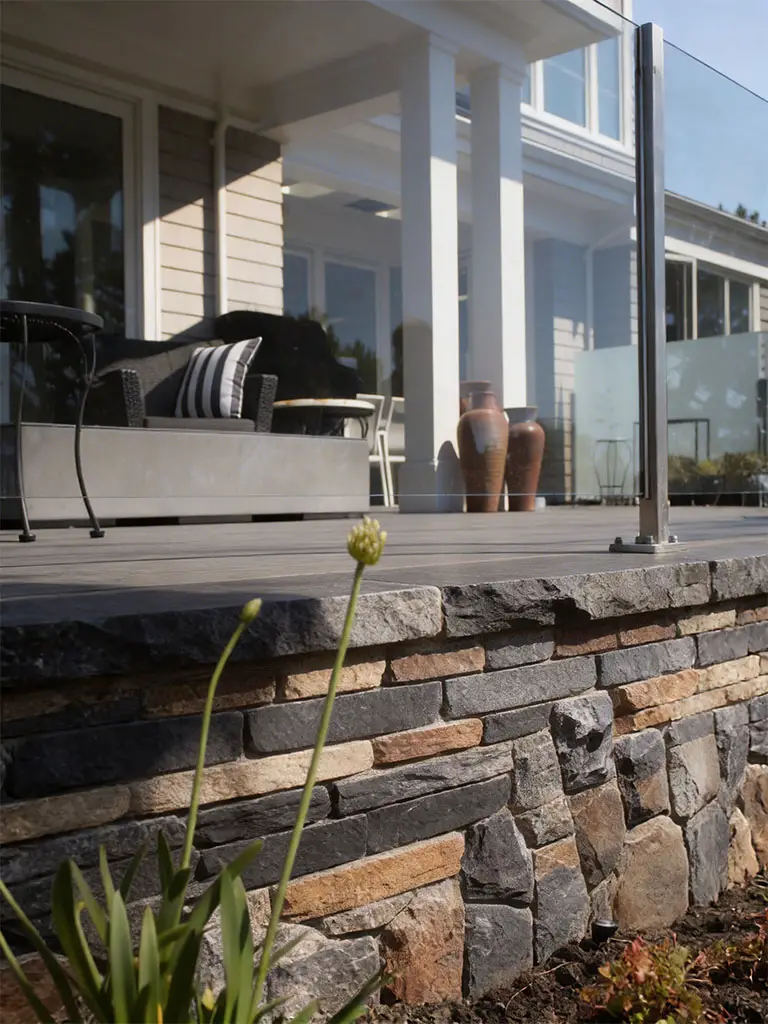 This striking contemporary deck features a combination of glass railing panels and stone base skirting. Sleek glass framed in matte metal sits above stacked stone in cool gray and charcoal, creating both transparency and solidity. Strong horizontal and vertical alignment gives the layout a bold, modern edge. Bright daylight amplifies the crisp glass reflections, adding airiness to the design and highlighting the stone’s natural texture below.