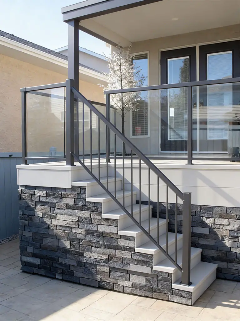 5. Modern Stacked Stone Skirting with Sleek Railing Contrast