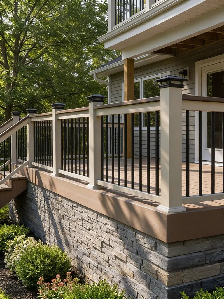 This modern deck combines stacked stone skirting in cool gray and greige tones with crisp light wood decking and streamlined black metal railings. The horizontal stone pattern offers a solid foundation, while black vertical balusters introduce contemporary contrast. Below, meticulous landscaping integrates the deck beautifully into its setting. Afternoon sunlight casts gentle, defined shadows, giving the entire setup a dynamic but uncluttered appearance.