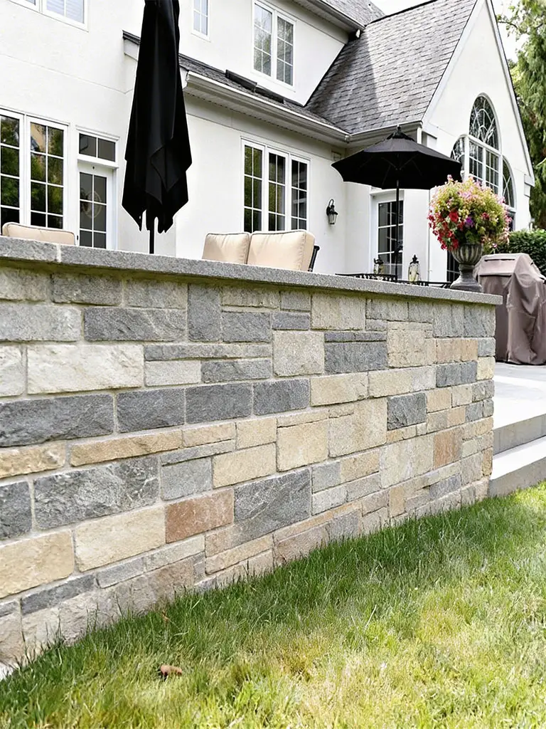 - Stone skirting: Ashlar-style, rectangular stone in cool gray, beige, taupe
