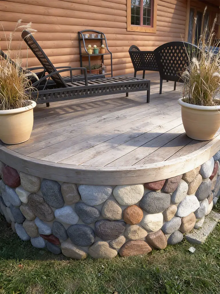This inviting deck scene feels straight out of a mountain lodge. The focal feature is the river rock skirting that wraps around the deck’s curved corner, giving off cabin-in-the-woods energy. The rounded river stones show a palette of soft gray, sandy beige, muted blue, and warm taupe, creating a beautiful contrast with the natural wood planks above. Large ceramic planters with ornamental grasses frame the scene, adding a green, organic accent. The overall look is relaxed and comforting, perfect for barefoot summer nights or your morning coffee ritual.